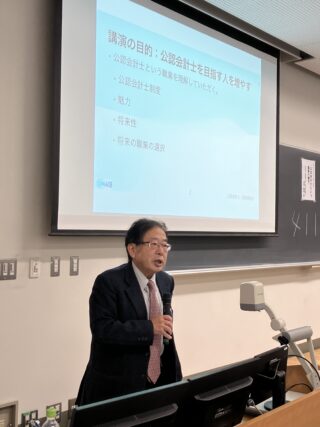 講演のテーマは「公認会計士という職業の魅力」であり、公認会計士の社会的使命、公認会計士の試験制度、公認会計士という職業の魅力などを分かりやすくご説明していただきました。本学科から会計専門職を目指す学生が増えることを期待しています。