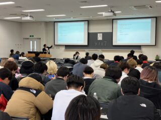 経営デザイン学科では、2025年11月13日(木)1講時、R421教室にて、武田紀仁准教授がご担当する1年生対象「簿記論」科目において、川島和浩教授の司会進行のもとで、公認会計士・監査審査会の青木雅明会長(東北大学名誉教授)をゲストスピーカーにお招きして特別講演を開催しました。