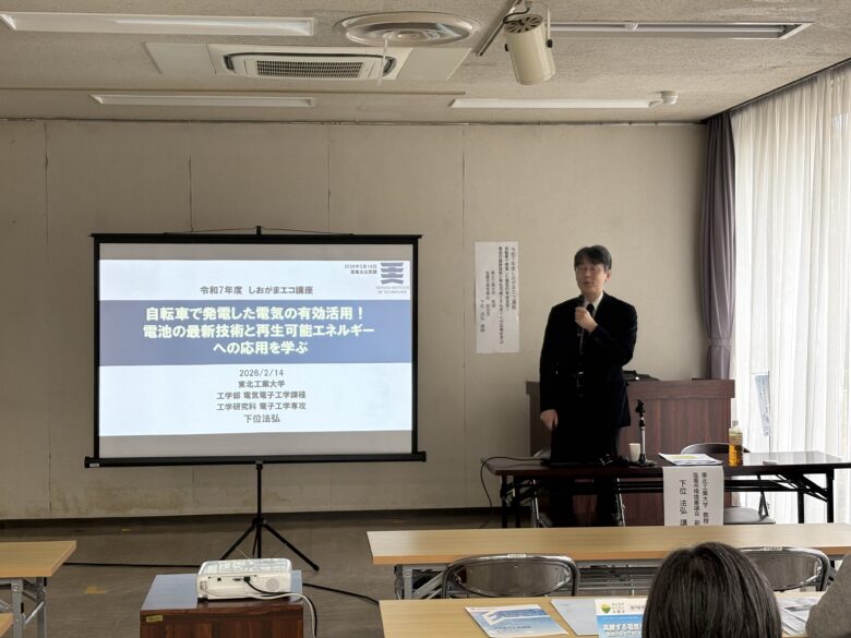 2月14日(土)、塩竃市「しおがまエコ講座」にて、工学部 電気電子工学課程 下位 法弘 教授が蓄電池のしくみおよび電池と再生可能エネルギーとの組み合わせによる最新技術の動向に関するテーマで講演を行いました。