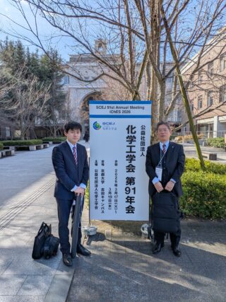 お知らせ / 2026.03.30 3月18日に大学院生の加藤憲治さん(佐藤善之研究室M1)が、化学工学会第91年会(京都大学)で学会発表しました。発表はポスター形式で実施され、多くの参加者の方とディスカッションをしておりました。 ・CO2/有機溶媒/ポリマー3成分系粘度の測定:高CO2組成領域への拡張,加藤憲治,佐藤善之