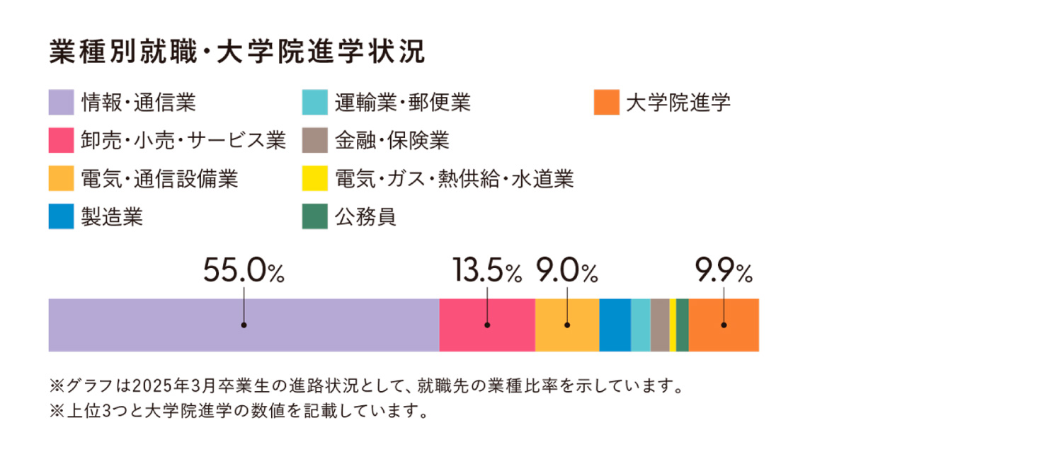 システムエンジニア/プログラマ/データサイエンティスト/通信システム技術者・研究者/ネットワークエンジニア/情報セキュリティ技術者・研究者/カスタマーエンジニア/組込みシステム開発エンジニア/情報システム管理者/通信情報設備 - 施工監理技術者/公務員/高校教員(工業・情報)/大学院進学 など