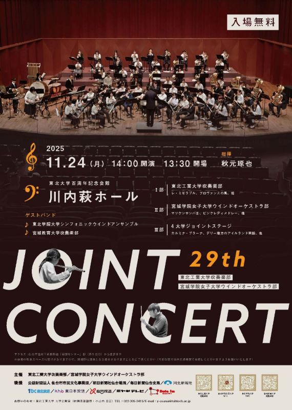 11月24日(月)、東北大学百周年記念会館「川内萩ホール」で、本学 吹奏楽部と宮城学院女子大学ウインドオーケストラ部による「29th Joint Concert」を開催します。