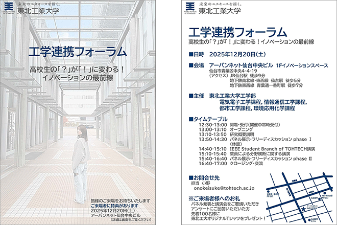 12月20日(土)、アーバンネット仙台中央ビル1階 イノベーションスペースで、工学部主催「工学連携フォーラム~高校生の「?」が「!」に変わる!イノベーションの最前線~」を開催します。皆様のお越しをお待ちしています。