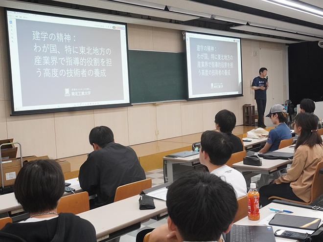 講話では、スローガンの意味や本学が目指す大学像を説明するとともに、「一人一人が自らのキャリアや将来像について、どのようなエスキースを描いて行くのかが大切。夢や目標を持って意識して活動して欲しい」と、学生にメッセージを伝えました。