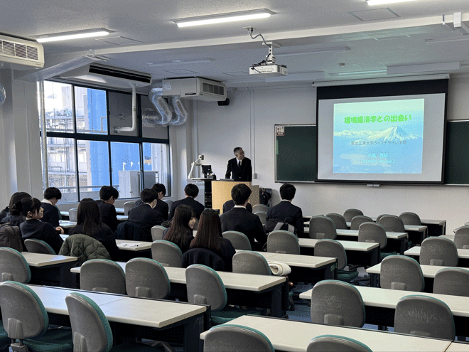 2年生33名に対して、本学3学部長(工藤 栄亮 工学部長、石井 敏 建築学部長、小祝 慶紀 ライフデザイン学部長)から、「大学における学問・研究とは」というタイトルで、どのようにして進路を見つけて歩んできたのか、自身の体験に沿った話や専門としている分野の話がありました。
