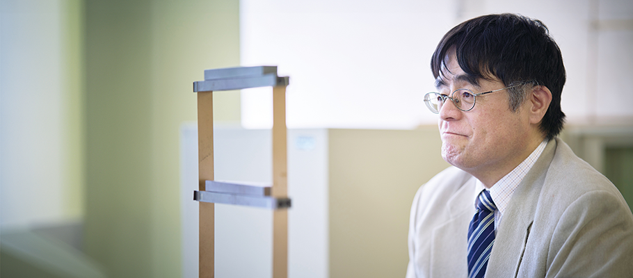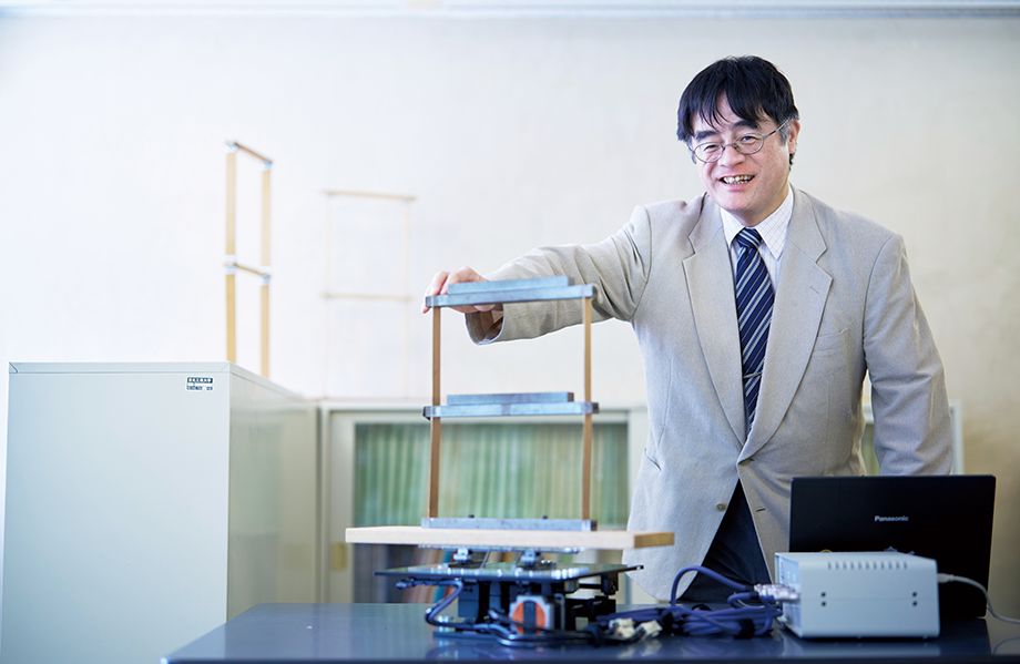 建物に大きなダメージを与える地震の揺れに着目し、振動を解析するためのシンプルな構造モデルを用いて実験に取り組む堀先生。地震の揺れの周期やパターン、建築物の階層など、さまざまな条件下で計測とデータ採取、解析を繰り返します。宮城県沖地震や東日本大震災が壊滅的な被害をもたらした東北の地にあるからこそ、地震の被害を受けない建物や揺れない建物を造って暮らしの安全を守る方法を模索しています。