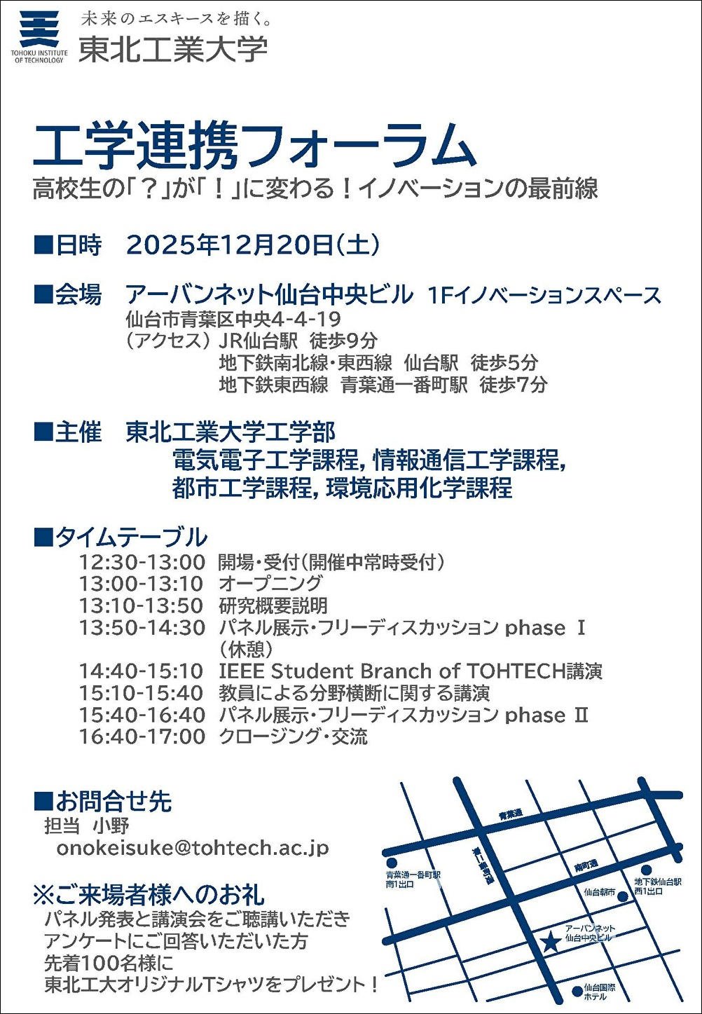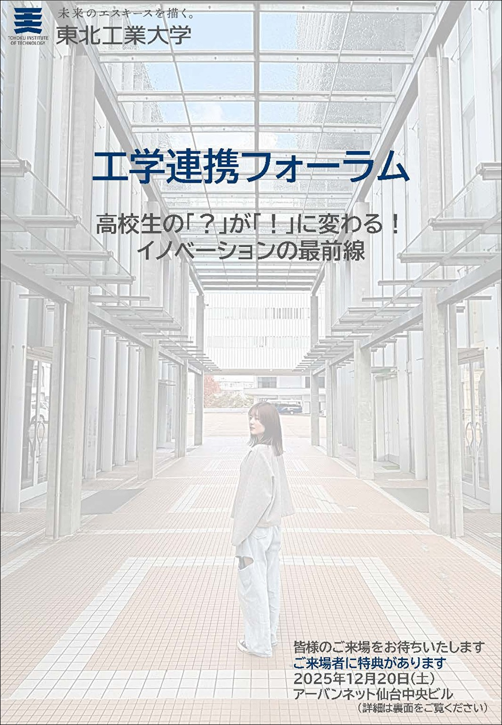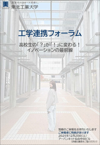 12月20日(土)、アーバンネット仙台中央ビル1階 イノベーションスペースで、工学部主催「工学連携フォーラム~高校生の「?」が「!」に変わる!イノベーションの最前線~」を開催します。皆様のお越しをお待ちしています。