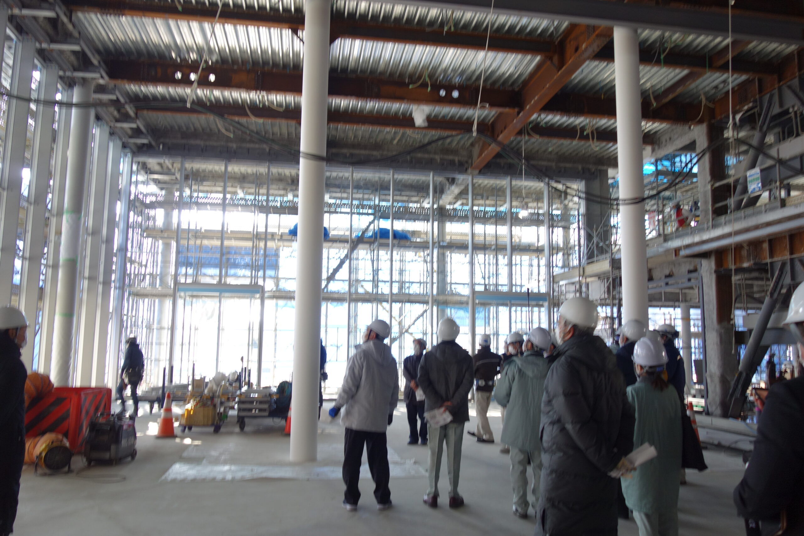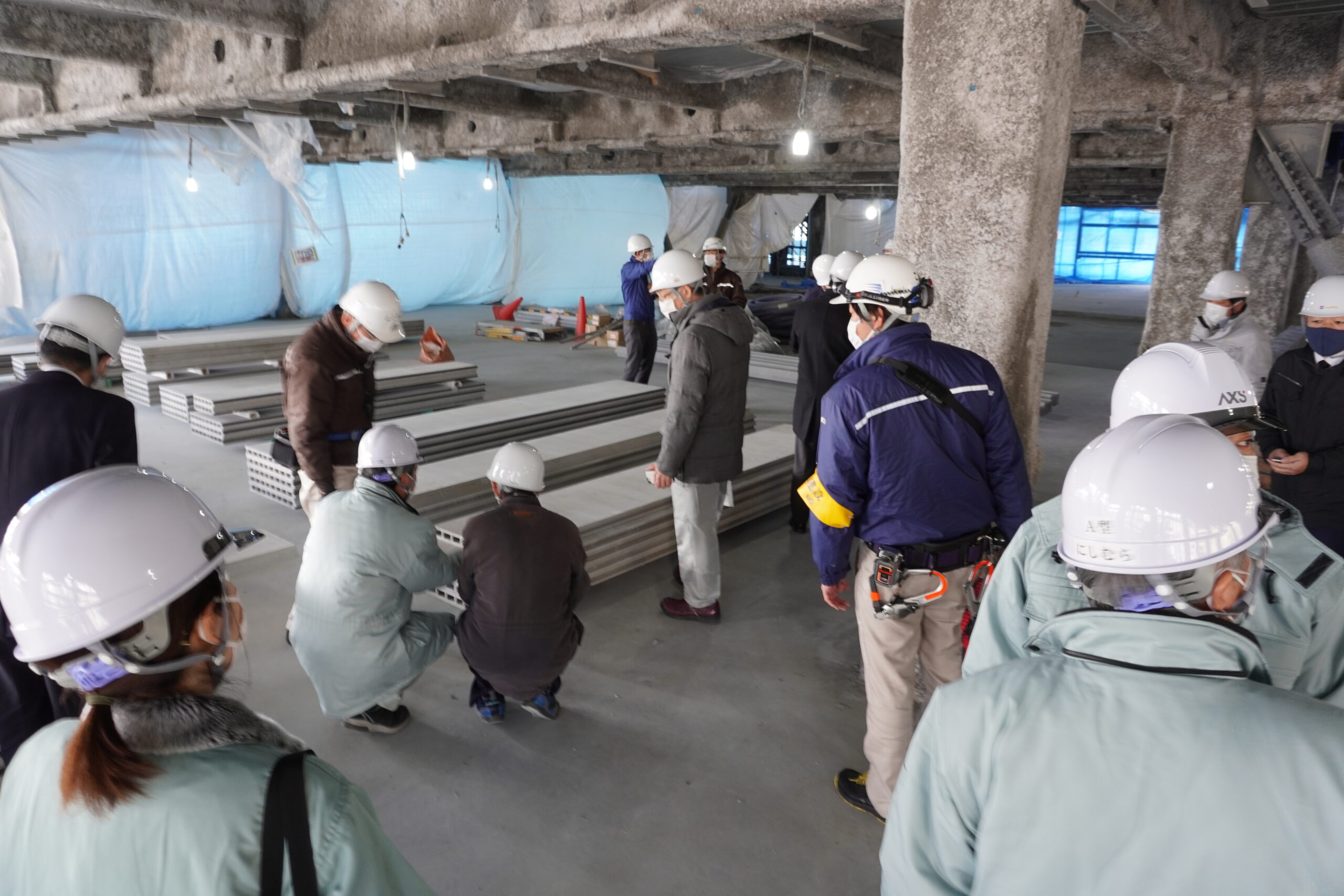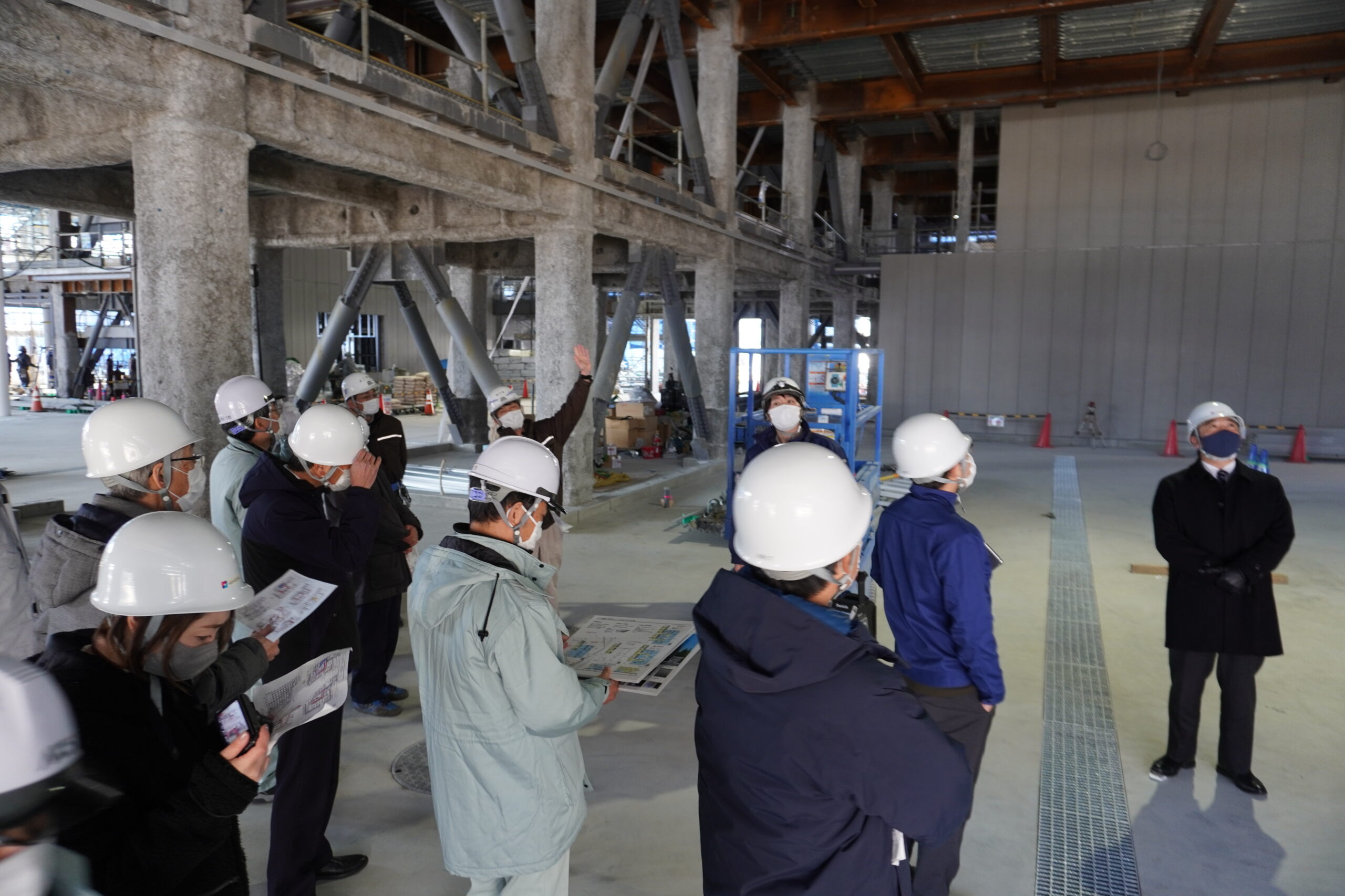 2022.01.27 1月27日(木)、新築工事現場見学会が行われ、渡邉学長をはじめとする本学関係者16名が参加しました。 はじめに、設計・監理の前見 氏より工事概要の説明、現場所長の結城 氏より進捗状況について説明がありました。現在、9月の竣工に向けて順調に工事が進んでいるとのことでした。 その後、工事現場に案内され、各フロアを巡回しながら説明を受けました。参加者は配付された図面を片手に、建設中の建物を肌で感じながら興味深く説明に耳を傾けていました。