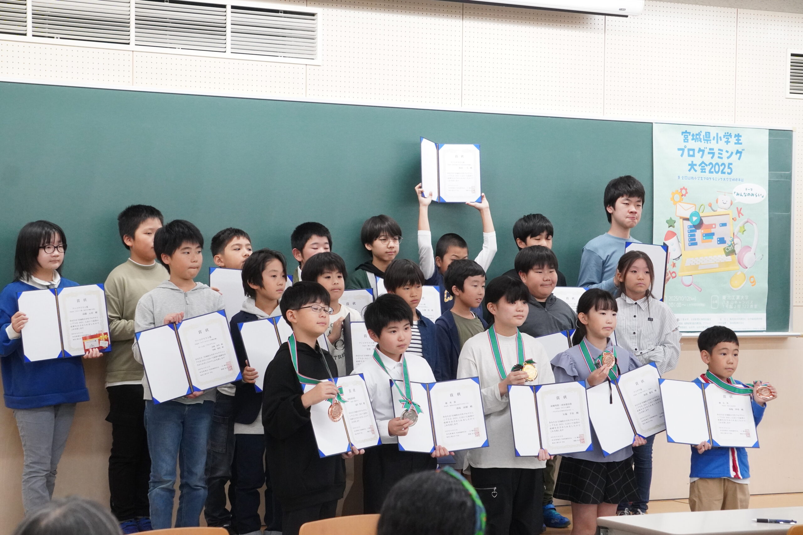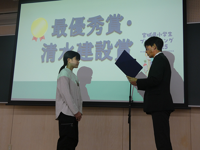 審査委員長の工学部 電気電子工学課程 室山 真徳 教授を中心に発想力や表現力、技術力の観点で作品の審査が行われ、最優秀賞・清水建設賞に矢端 千佳さんの作品「みらいの踏切~ずんだもんが命を守るのだ! ~」が選出されました。矢端さんは2026年3月、東京で開催される全国選抜小学生プログラミング大会に2年連続で出場することになりました。