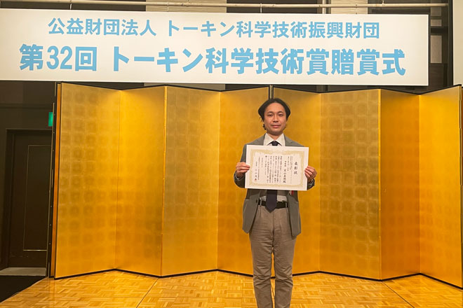 本学 工学部 電気電子工学科 室山 真徳 准教授が2022年3月8日(火)に仙台国際ホテルで、公益財団法人トーキン科学技術振興財団(*)第32回(令和3年度)トーキン科学技術賞の贈賞式が行われ、「MEMS-LSI集積化触覚センサネットワークシステムの研究開発と実用化への展開」の研究で、トーキン科学技術賞を受賞しました。