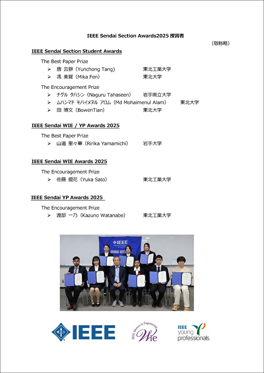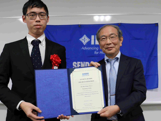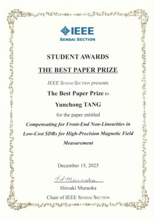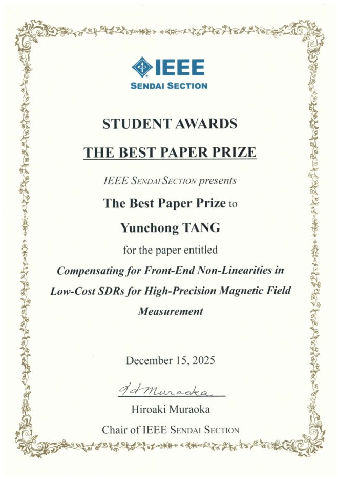 12月15日(月)、大学院 工学研究科 通信工学専攻 博士(後期)課程 3年 唐 云翀 さん(電磁波応用工学研究室/指導:袁 巧微 教授)が、IEEE Sendai Section Student Awardsの優秀賞 The YP Encouragement Prizeを受賞しました。