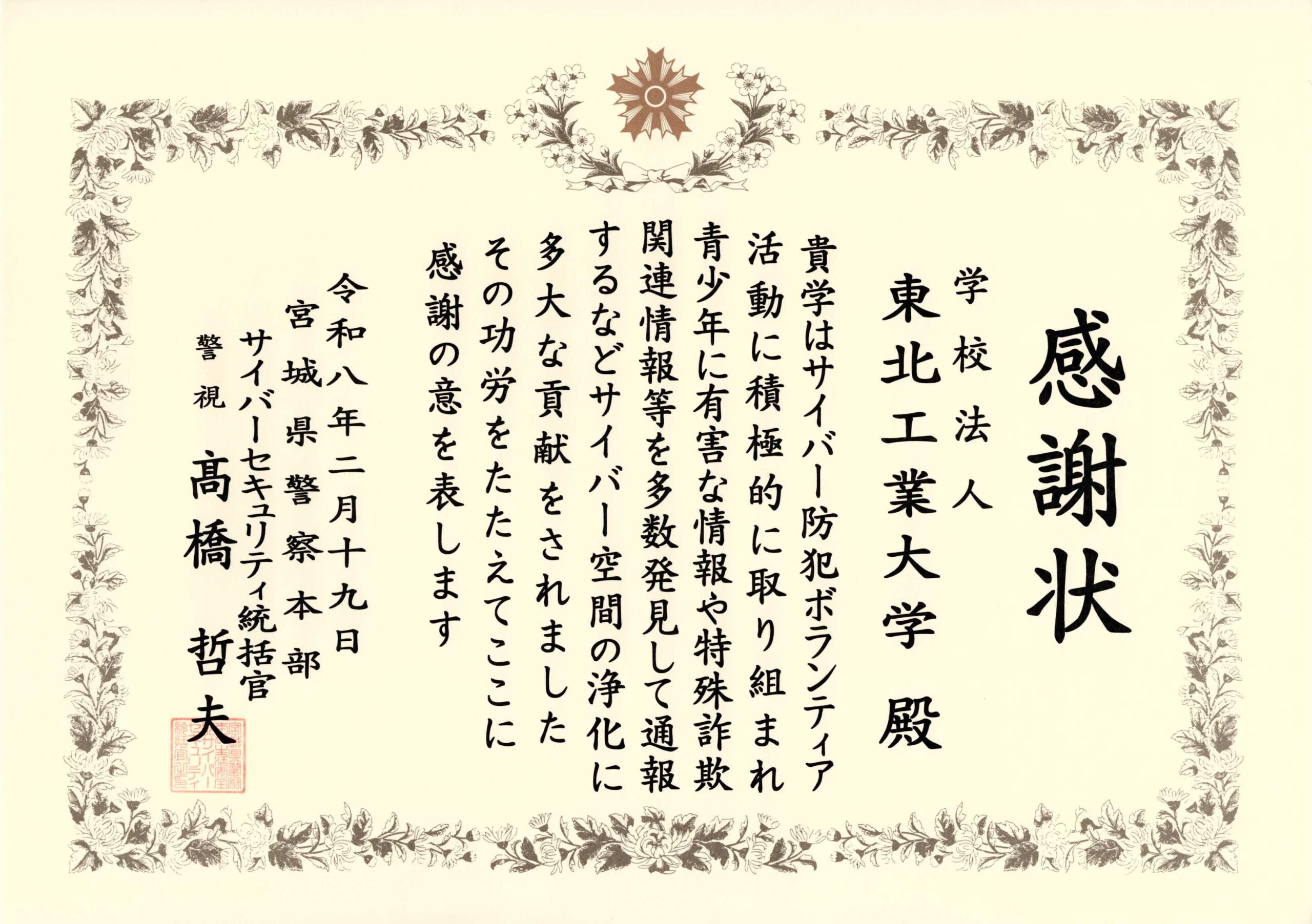 2月19日(木)、宮城県警察本部でサイバー防犯ボランティア活動に貢献した本学学生と本学に宮城県警察から感謝状が贈呈されました。