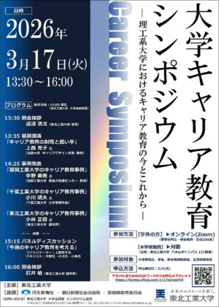 このシンポジウムは、特に理工系大学におけるキャリア教育の取組事例から、2011年の義務化以降急速に発展したキャリア教育を振り返るとともに現状と共通課題についての認識を共有し、自律的なキャリア形成力を身に付けた理系人材の育成、ならびに多様化する学生の学びのモチベーション向上に繋がるような、今後のキャリア教育のあり方について考察することを目的として開催するものです。